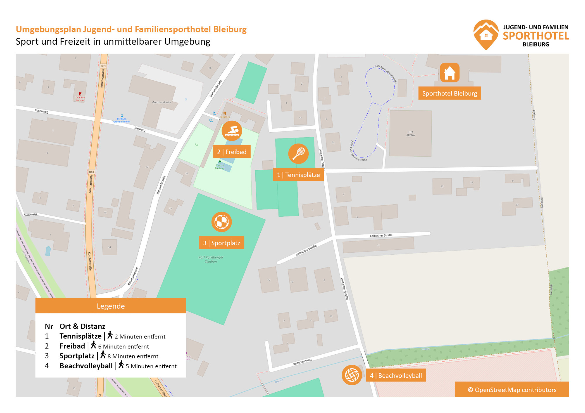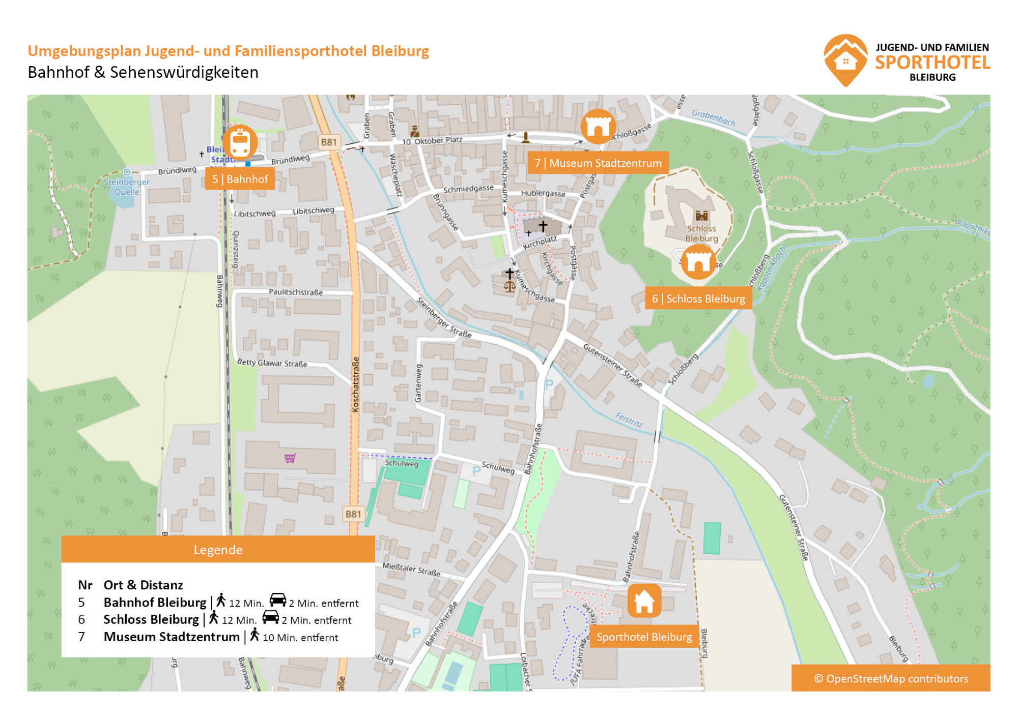 Das Hotel liegt ruhig am Ortsrand von Bleiburg – das Zentrum, der Bahnhof sowie zahlreiche Sportanlagen (Freibad, Tennisplätze, Beachvolleyball, Fußballplätze) sind zu Fuß erreichbar.