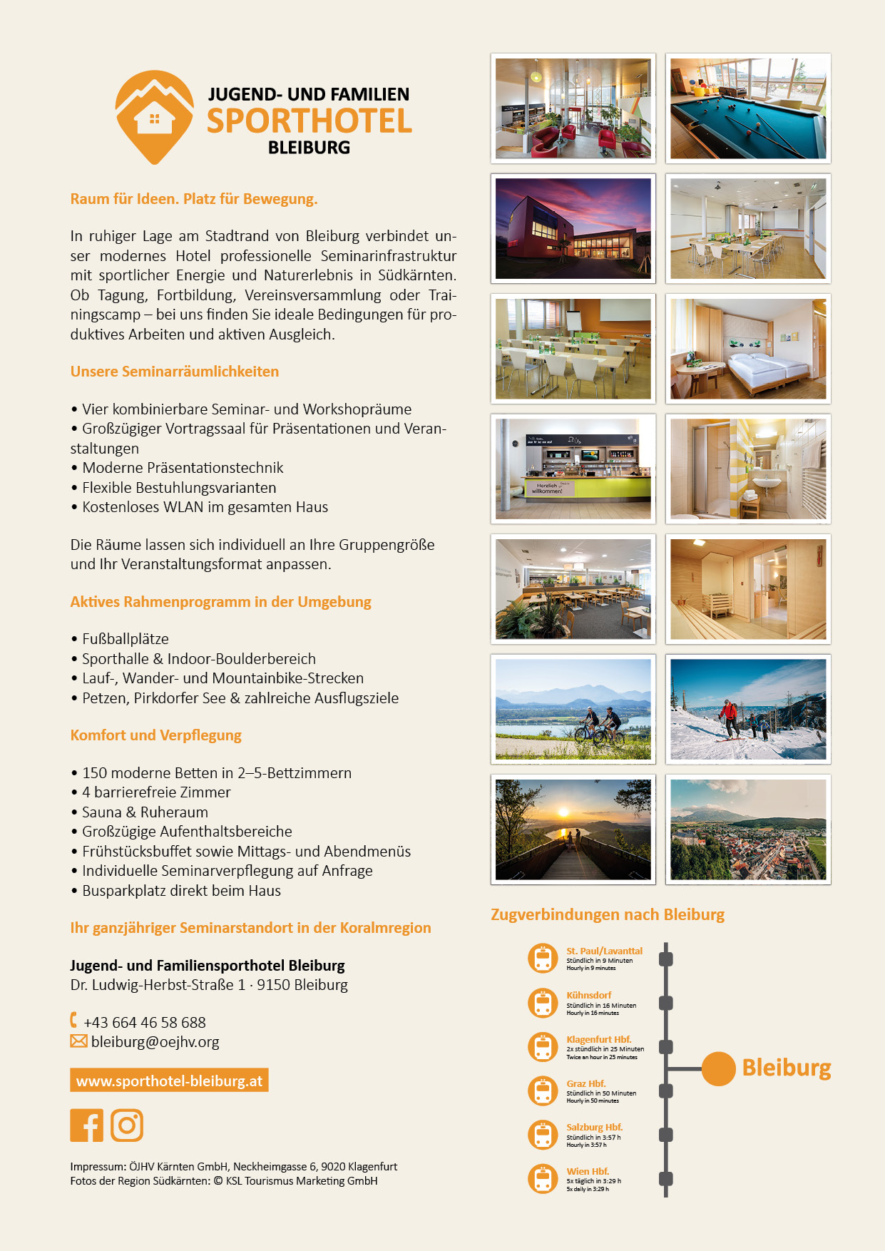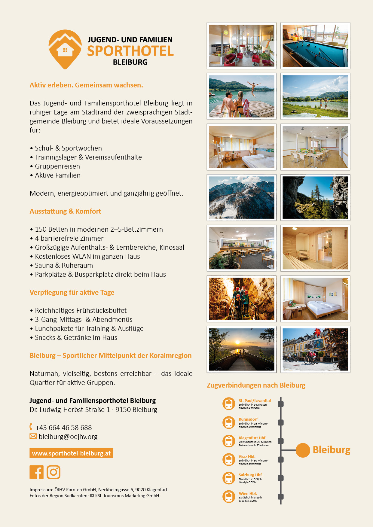 Zwischen dem majestätischen Berg Petzen und den warmen Kärntner Badeseen liegt das Jugend- und Familiensporthotel Bleiburg – ein energieoptimiertes Passivhaus mit 150 Betten, modernen Zimmern und perfekten Bedingungen für Trainingslager, Schulwochen, Seminare und Familienurlaube. Hier treffen Natur, Bewegung und Gemeinschaft auf Komfort, regionale Kulinarik und ein inspirierendes Lern- und Freizeitangebot.